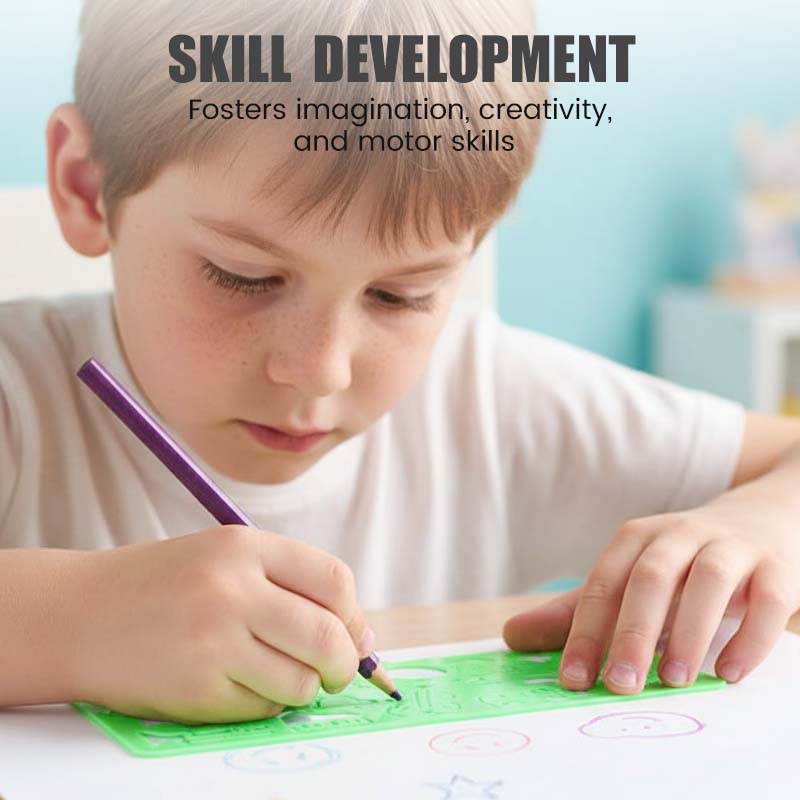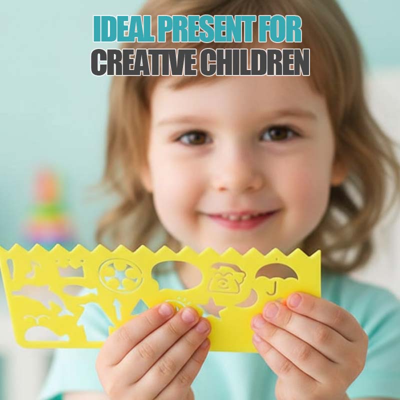VISUAALINEN VIETO: Kirkkaat siniset, keltaiset, vihreät ja vaaleanpunaiset värit tekevät näistä piirustussapluunoista erittäin viehättäviä. Jokaisessa on ainutlaatuiset ja mukaansatempaavat muodot, jotka on suunniteltu herättämään lasten huomion.